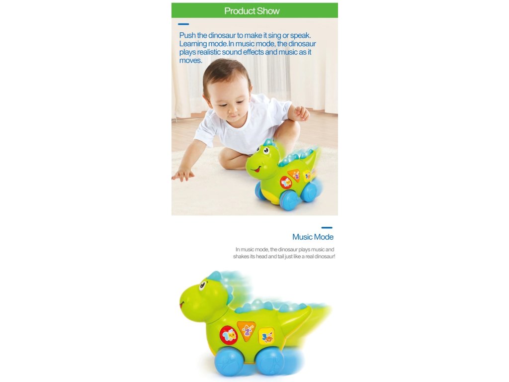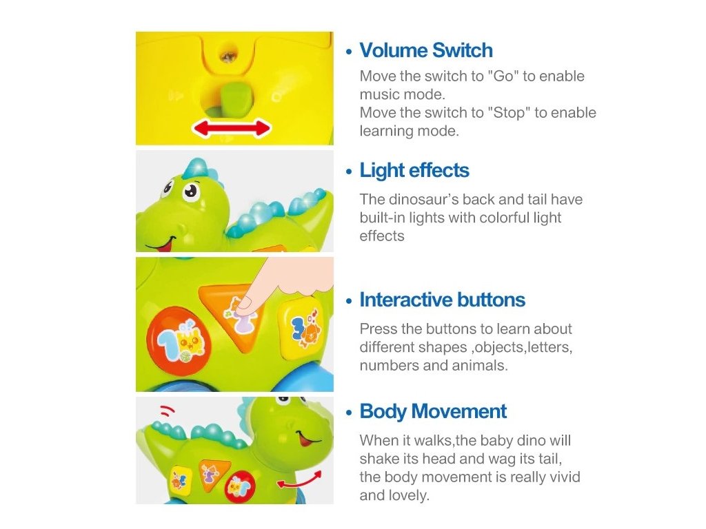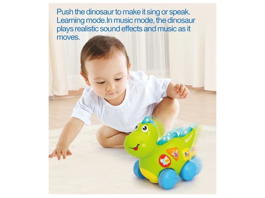 - Dinosaurus může vašeho malého chlapce nebo dívku naučit základy čísel, písmen, tvarů, potravin a zvířat, pouhým stisknutím správných tlačítek!